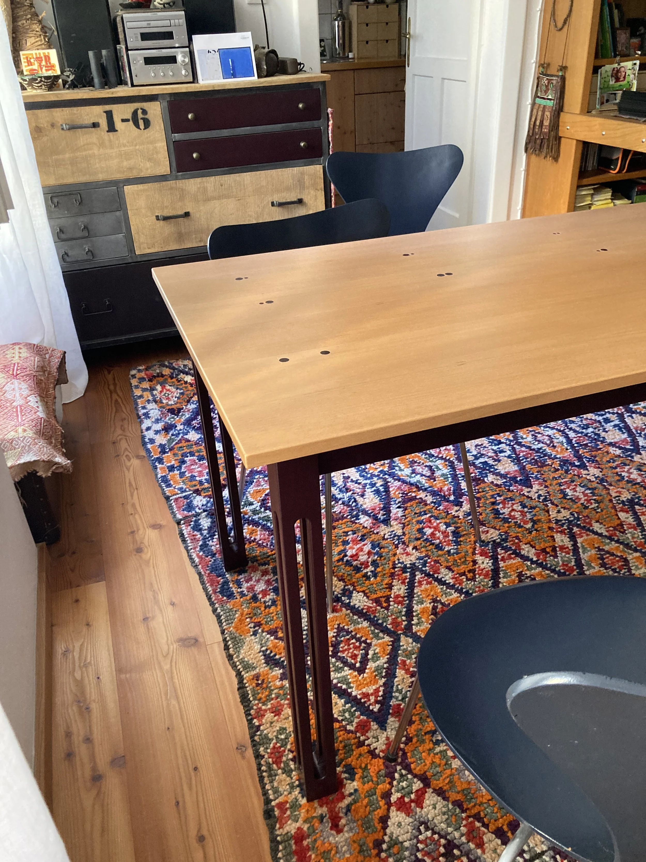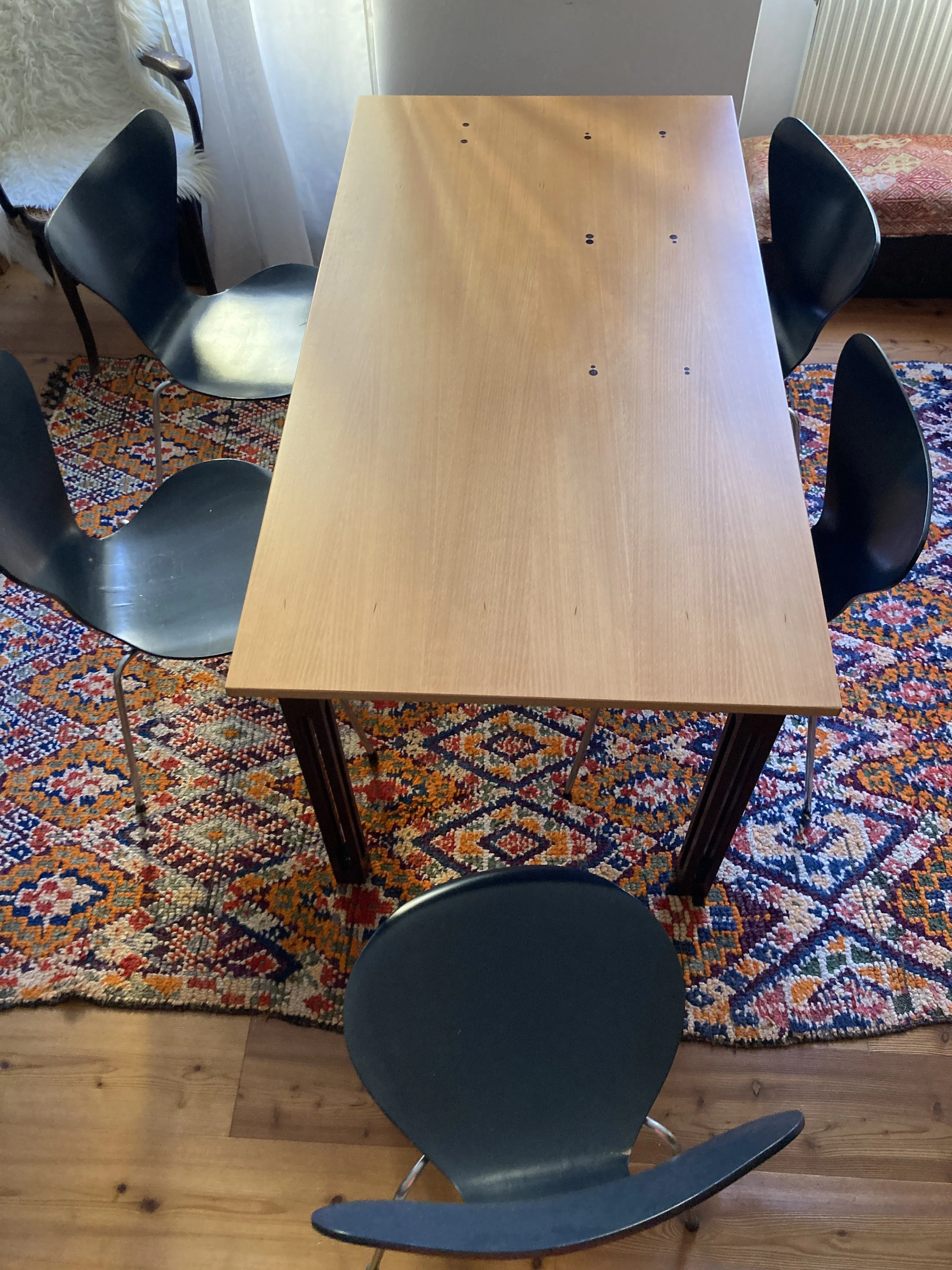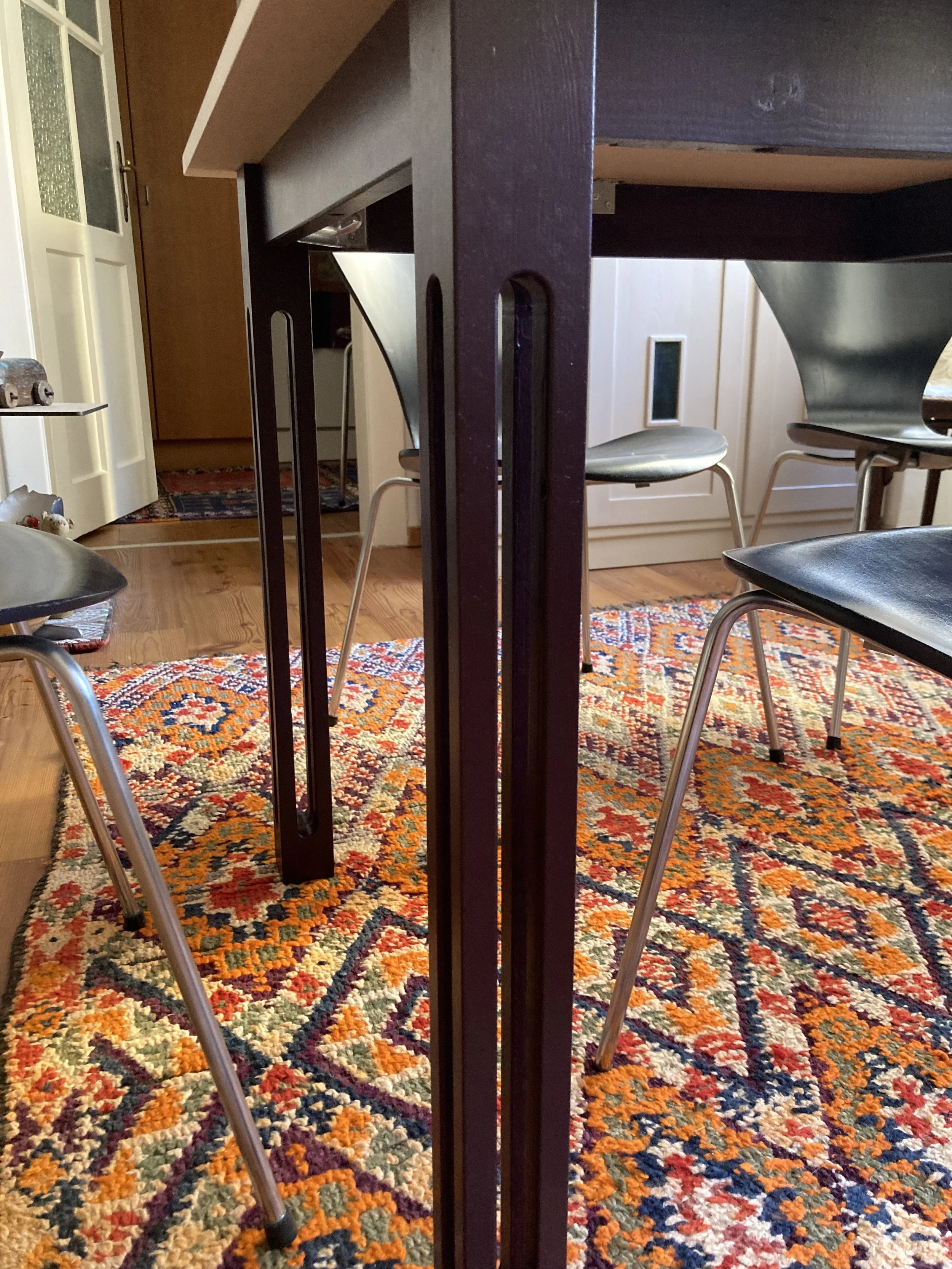 Haken ausbohren, Beine fräsen, Farbe tupfen, auf den Teppich bringen.